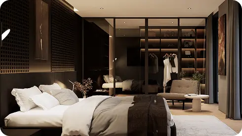 The master bedroom at Psusennes is a refined sanctuary where dramatic dark textures and warm timber flooring create a harmonious space for rest. Every element is carefully balanced to provide an extraordinary and tranquil escape.